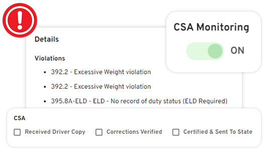 Get automated alerts about CSA inspections, violations and DOT recordable crashes.