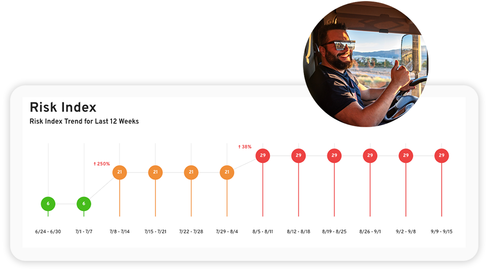 We transform your driver monitoring data into a precise numerical score, reflecting each driver’s performance—where a higher score indicates a greater risk to your business. Monitor these scores over time to identify and address risky behaviors before they become habits.